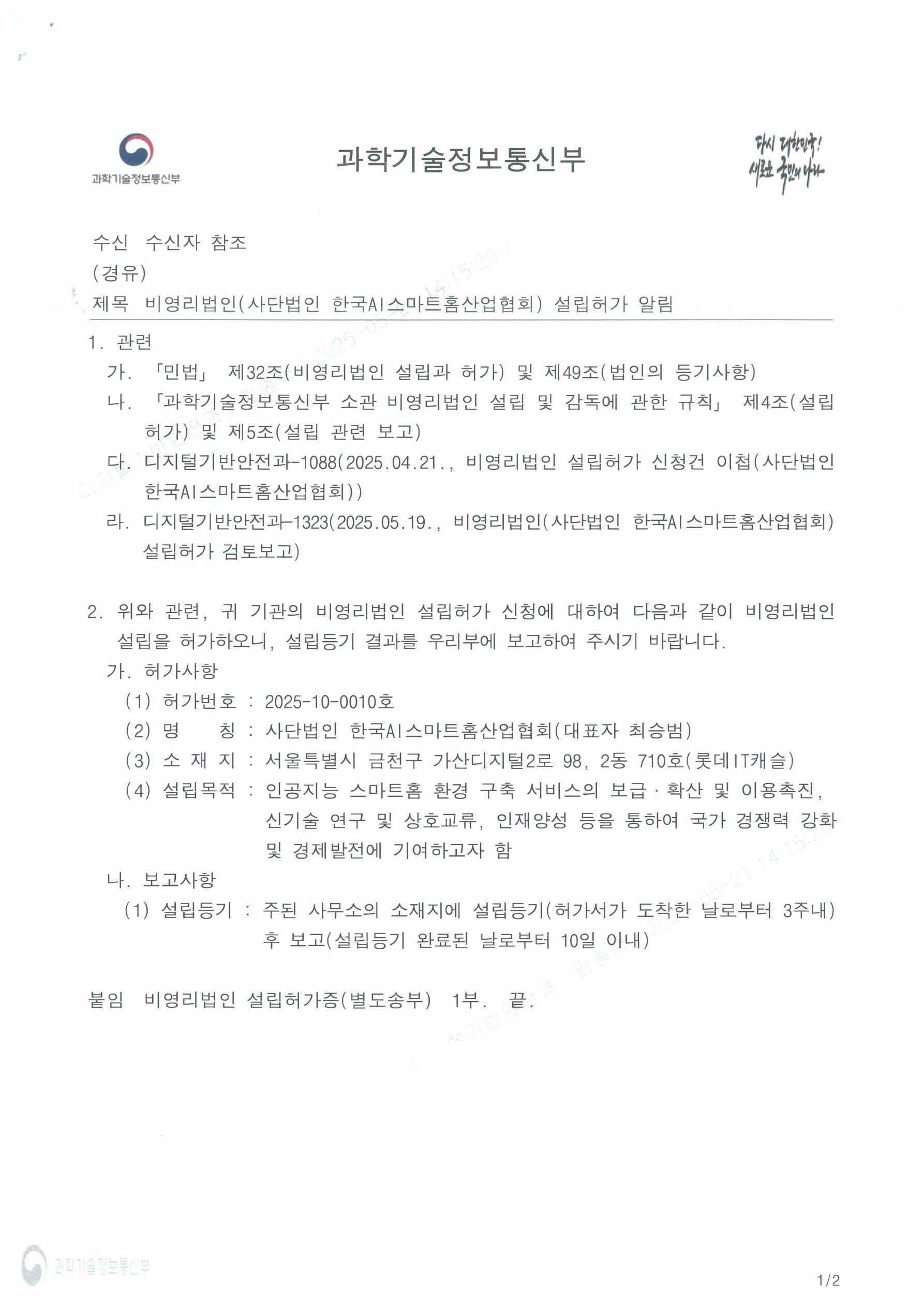 협회 과학기술정보통신부 법인설립 허가(부처 복수등록)