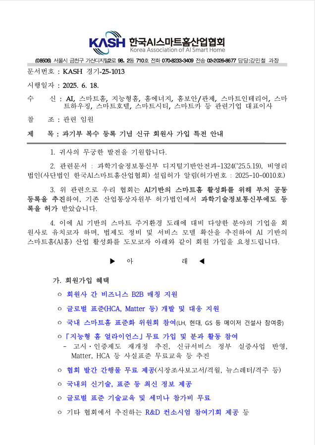 협회 과기부 등록 기념 회원사 가입 특전 안내