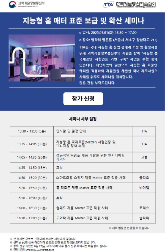 매터(Matter) 표준에 관심이 있으시거나, 제품 개발을 준비하고 계신 국내 관계자들의 많은 관심 부탁드리며