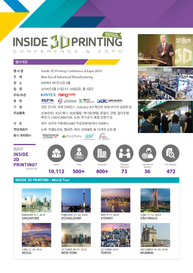 글로벌 3D프린팅 컨퍼런스(인사이드 3D프린팅)는 2013년 뉴욕을 시작으로 세계 10여개 주요 도시에서 개최되는