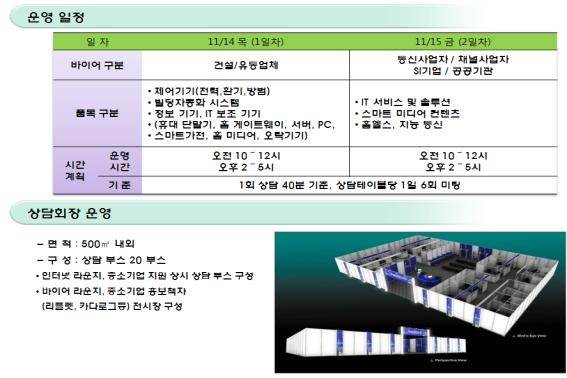 전시 기간 내 대․중소기업간 동반성장의 확산과 신기술을 개발한 중소기업과 바이어와의 실질적인 비즈니스 협력의 일환으로 스마트홈 산업 구매상담회를 개최하오니 참가를 희망하시는 기업에서는 신청하여 주시기 바랍니다.