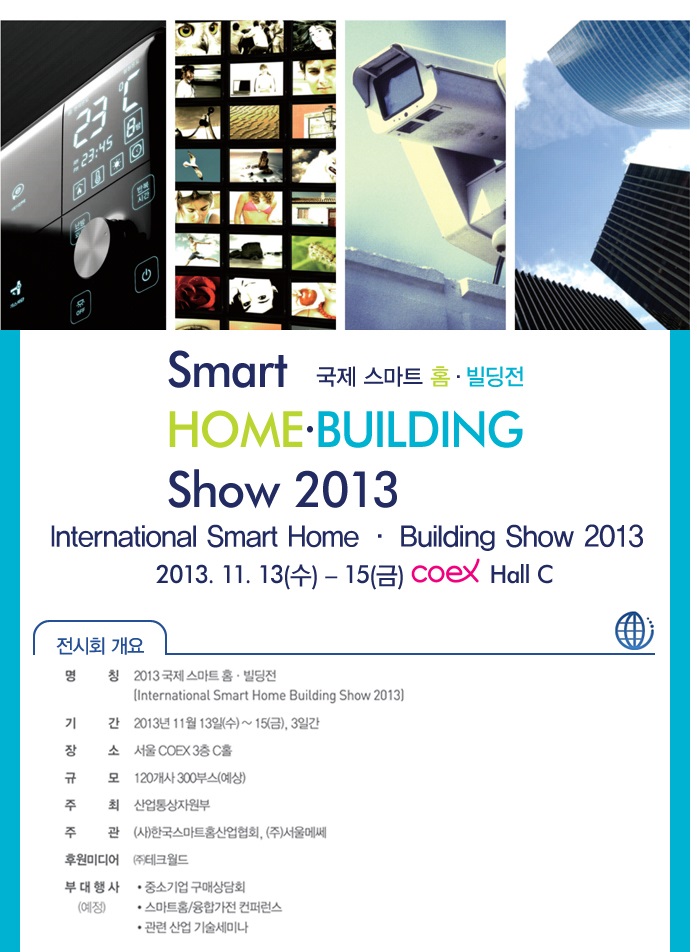 2. 국내 유일의 스마트홈·빌딩 전문전시회인 「2013 국제스마트 홈·빌딩전」이 2013년 11월 13일부터 11월 15일까지 3일간 서울 코엑스 3층 C홀에서 개최됩니다.