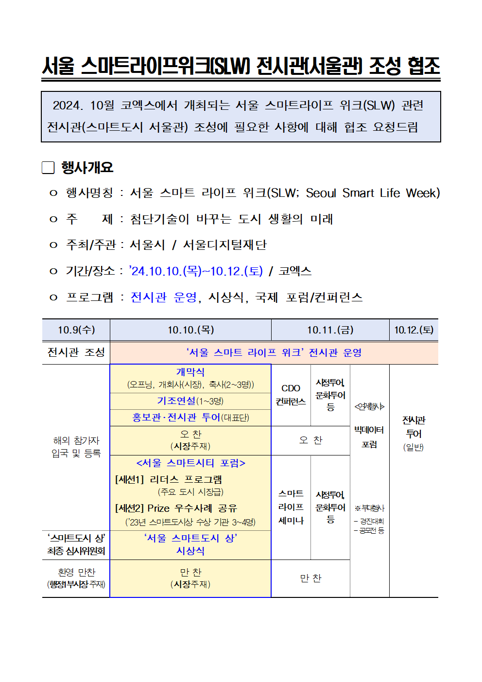 SH공사에서 서울 스마트라이프위크(SLW) 전시관(서울관)을 조성하오니 참여하실 분 또는 관심있는분께서는